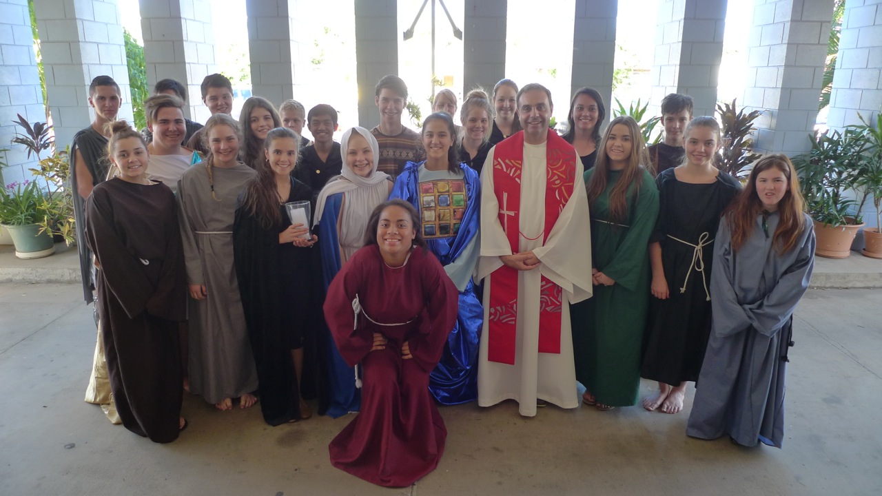 Padre Eraldo con i ragazzi della scuola di Mount Isa, che hanno messo in scena la Passione del Venerdì Santo