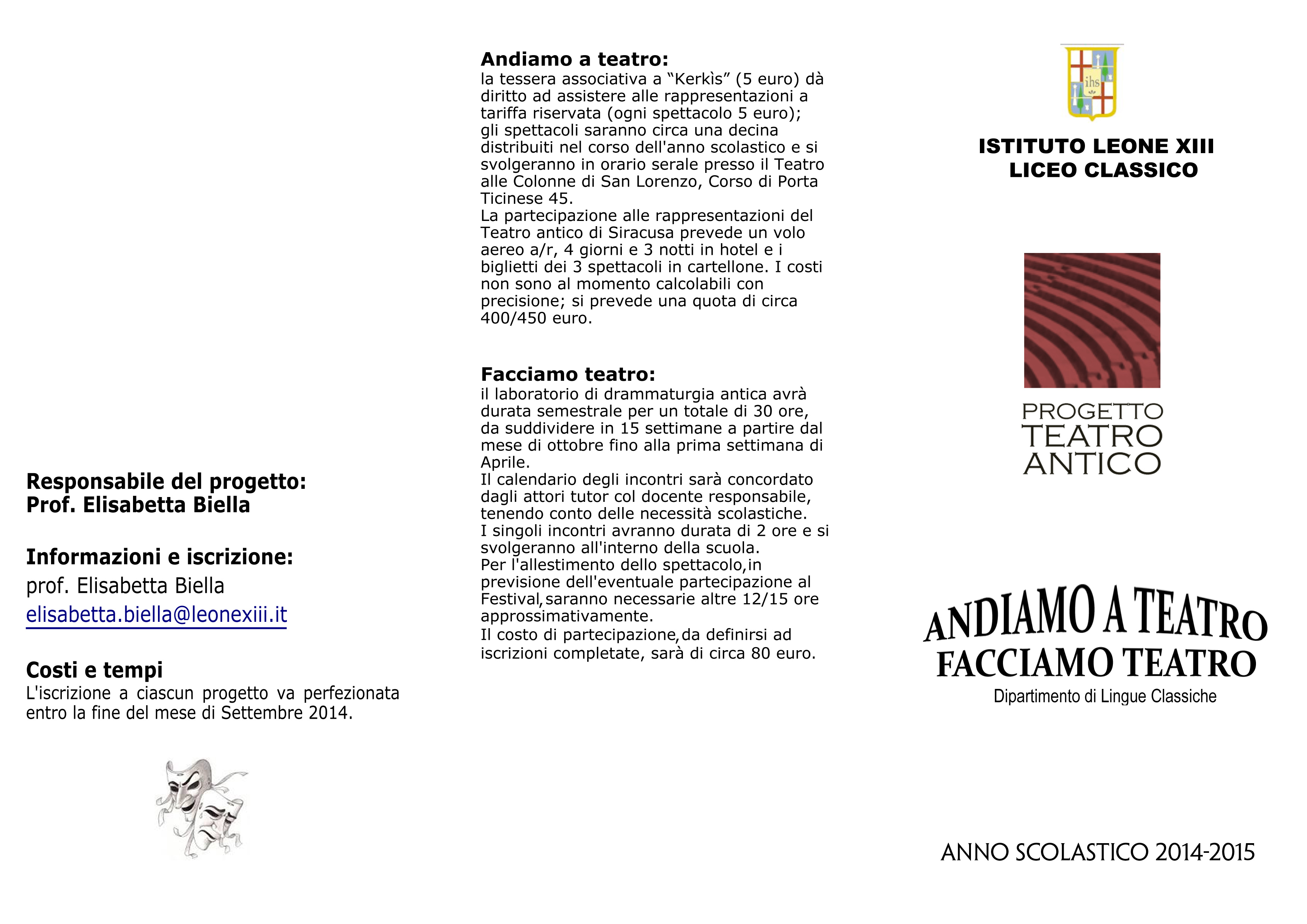 Ottobre 13, 2014 Categoria: News, Home pageQuesto mese di ottobre vede nascere due progetti sul teatro antico, rivolti agli studenti del Liceo Classico del nostro Istituto: Andiamo a Teatro e Facciamo Teatro.