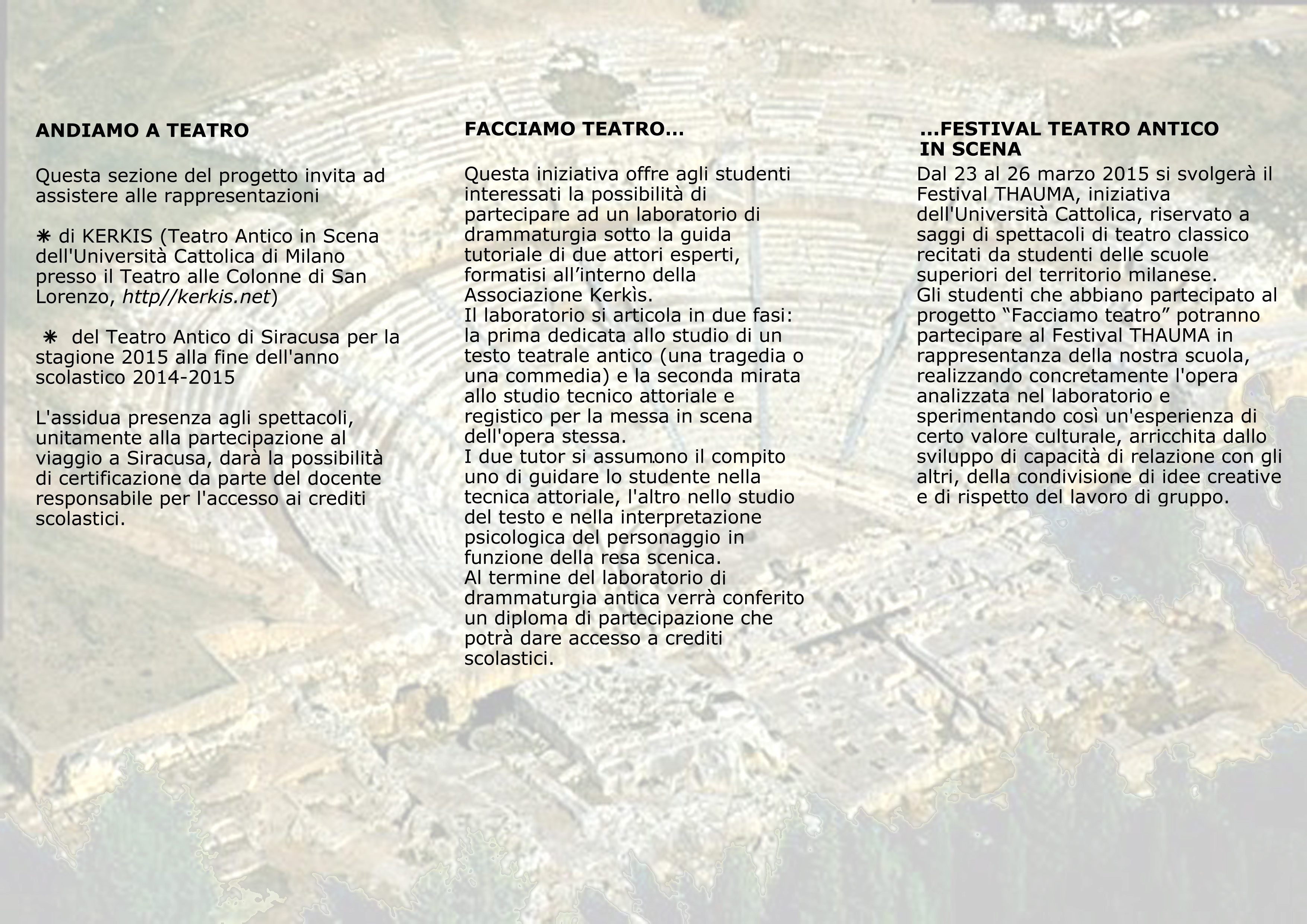 Il secondo progetto, Facciamo Teatro, è un vero e proprio laboratorio di drammaturgia antica, che vede gli studenti impegnati in un primo momento nello studio di un testo teatrale antico (quest’anno è l’Elena di Euripide), sotto la guida di chi scrive e di due attori tutor dell’associazione Kerkìs; la seconda fase consiste in uno studio delle tecniche attoriali e registiche, con l’obiettivo di una messa in scena antologica dell’opera scelta. Al termine del progetto c’è la possibilità di partecipare a Thauma, festival organizzato dall’Università Cattolica, riservato a saggi di spettacoli di teatro classico, recitati da studenti delle scuole superiori del territorio milanese.