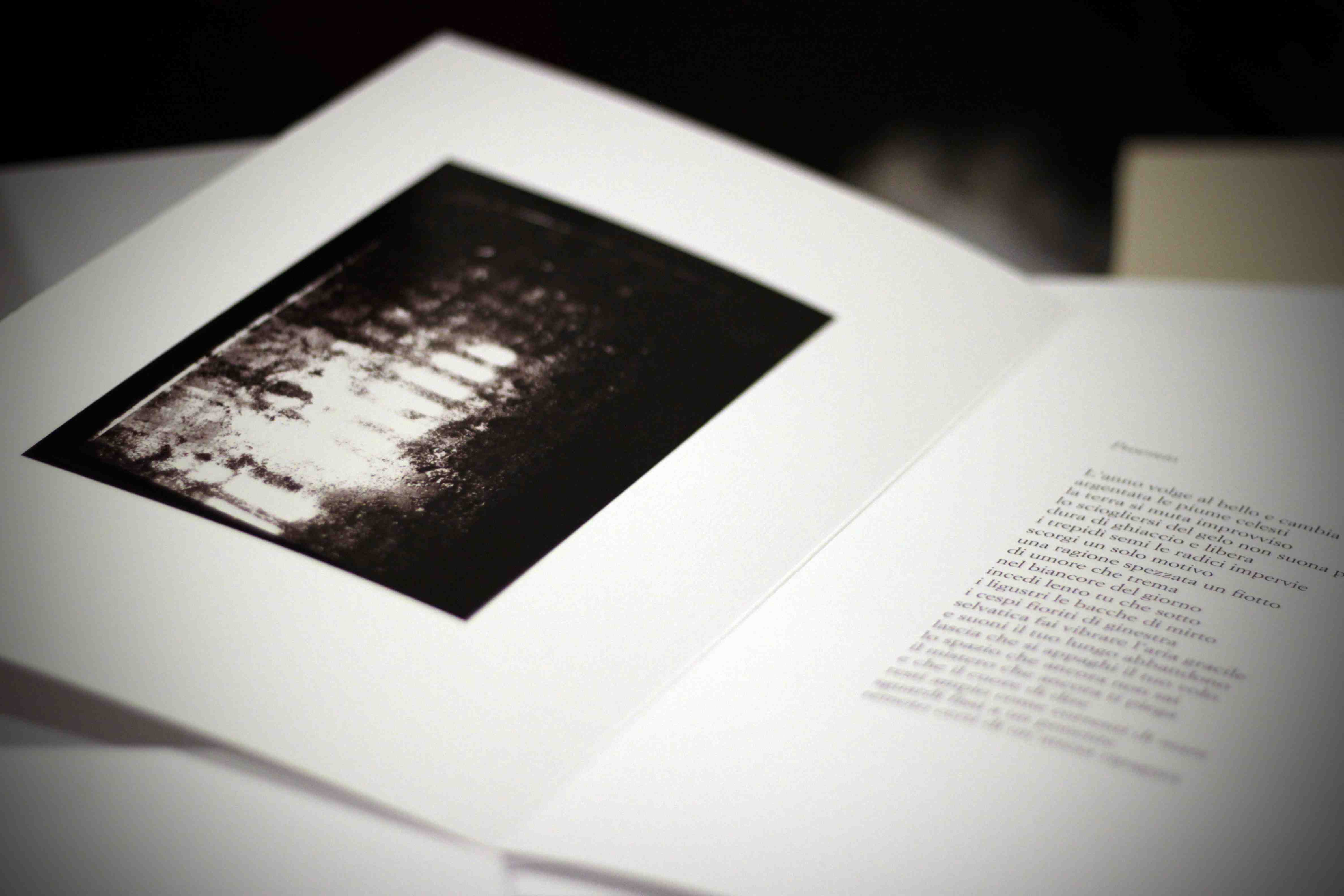 Le fotografie, stampate su carta fotografica lucida, sono applicate ad ogni quartino e sono tutte in bianco e nero, tranne l’immagine centrale, a colori.
