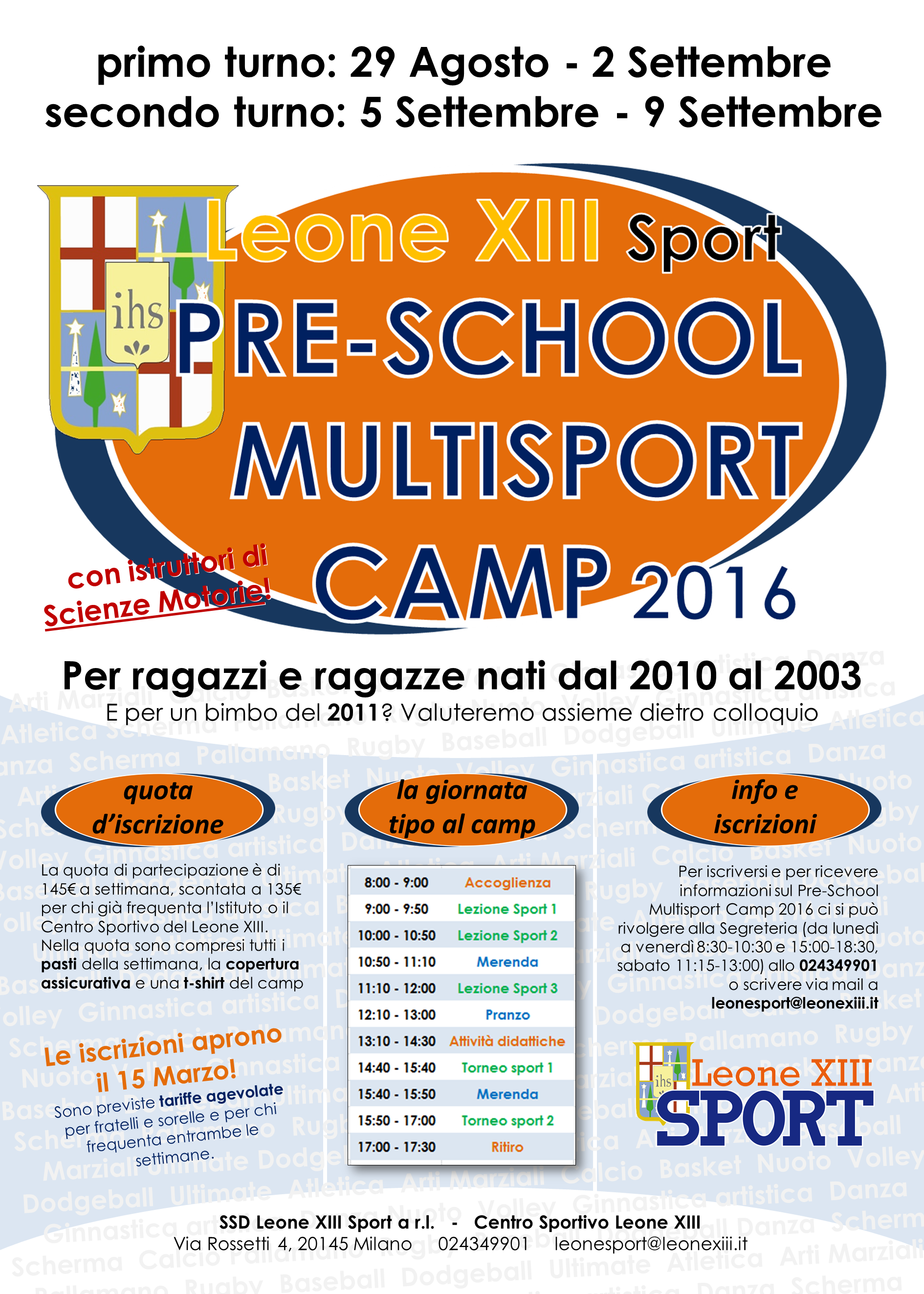 Per info e iscrizioni ci si potrà rivolgere direttamente agli uffici del Centro Sportivo: la Segreteria della Leone XIII Sport è aperta dal lunedì al venerdì dalle 8:30 alle 10:30 e dalle 15:00 alle 18:30; al sabato dalle 11:15 alle 13:00. Oppure è possibile inviare una mail a leonesport@leonexiii.it.