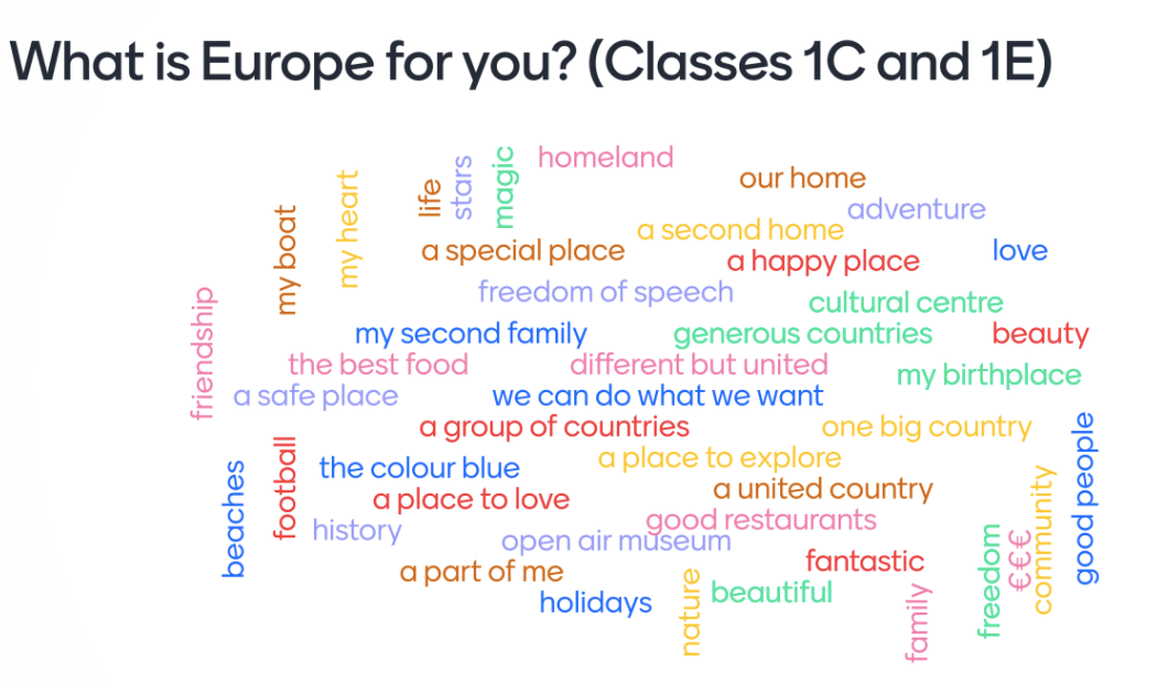 Ci stavamo veramente divertendo e stavamo imparando, ma il tempo scorre! Prima di salutarci volevo che anche i ragazzi producessero qualcosa usando tutto quello che avevano appena imparato e così ho posto loro una sola e semplice domanda: “What is Europe for you?“. Ho lasciato qualche minuto per pensare a una parola o a una frase che ricordasse l’Europa e il risultato è stato veramente sorprendente: tutti hanno detto la loro, producendo persino dei pensieri molto profondi per la loro età e facendomi veramente capire che avevano appreso fino in fondo dei concetti molto importanti.