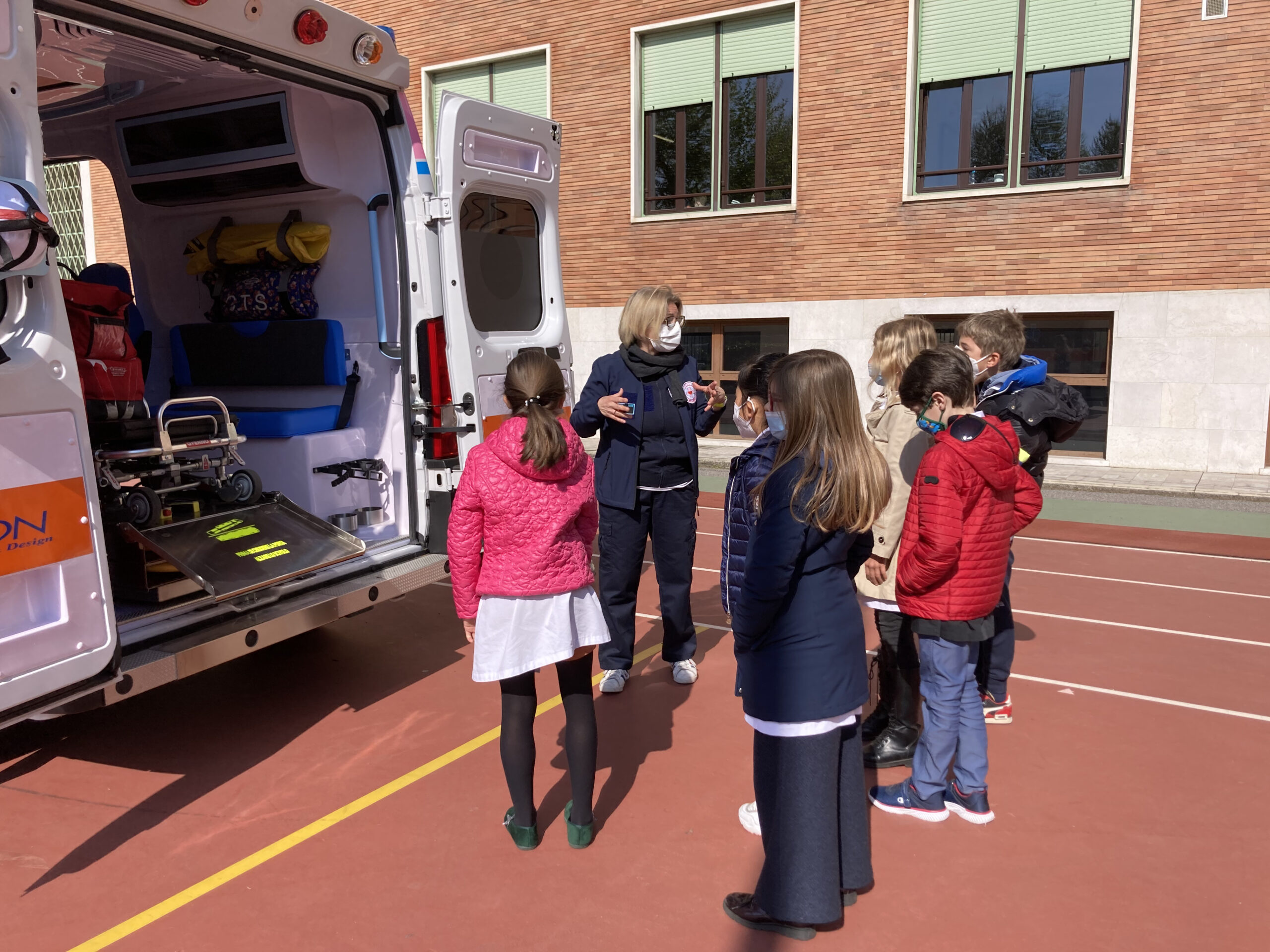 L’esperienza si è conclusa osservando, a piccoli gruppi, l’interno e l’esterno di un’ambulanza che ha accennato anche a un suono di sirena forse allarmando un pochino docenti e studenti ignari della bella iniziativa in corso.