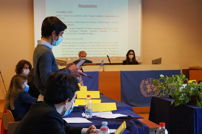 Filippo Astolfi (USA): Questa esperienza l’avevo già fatta diversamente l’anno scorso ad Abu Dhabi. Ed era stata un po’ diversa perché erano presenti anche persone di altre parti del mondo. Quest’anno inizialmente ero un po’ titubante sul partecipare o no, poi alla fine mi sono convinto e non me ne sono assolutamente pentito: è stata un’esperienza che mi è davvero piaciuta molto. Sicuramente è necessaria una preparazione importante, nel senso che richiede del tempo che va ben oltre l’orario scolastico. Però alla fine il risultato secondo me ripaga completamente: si approfondiscono argomenti di geopolitica che sono importanti e spesso non ben conosciuti – e la simulazione vera e proprio è anche divertente. L’anno scorso ero rimasto un po’ più in disparte, forse anche perché era il mio primo anno, ma questa volta sono riuscito a mettermi davvero in gioco. Rappresentavo gli Stati Uniti. È un progetto che consiglierei e rifarei. Ovviamente bisogna anche calcolare il problema della lingua inglese, ma quest’anno, fra di noi, è stato un po’ diverso: ad esempio durante i momenti informali e nelle pause si poteva parlare anche in italiano. Il fatto che fossimo di nuovo tutti insieme dopo tutte le settimane in DaD è stato davvero bello: inizialmente ero un po’ dubbioso sul progetto fatto a distanza. Forse proprio perché, avendo già partecipato ad un Model UN, mi ero reso conto di come in realtà i momenti più importanti fossero quelli in cui si discute nei gruppi e questa cosa non me la riuscivo a immaginare molto in una versione a distanza: ero sicuro che si sarebbe perso qualcosa.