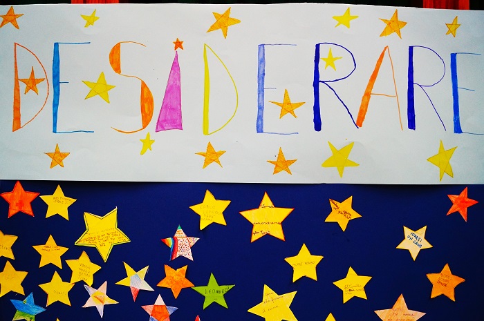 Con gli occhi al cielo, raccogliamo oggi tra le tante una di quelle stelle di cartoncino colorato: “vorrei che tutti fossero a scuola per stare insieme in armonia”.