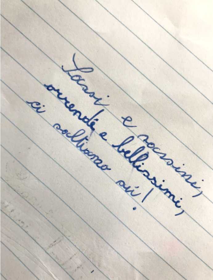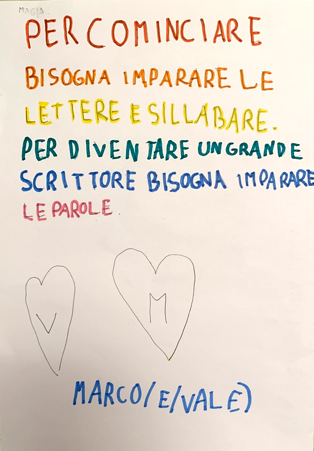 Alcuni bambini, ricordando i loro primi passi da lettori, hanno voluto raccontare l’orgoglio provato (B., 7 anni), il timore delle parole difficili (C., 10 anni ed E., 7 anni), l’importanza di non giudicare un libro dalla copertina (G., 10 anni), le storie della buonanotte raccontate da papà (D., 10 anni), le avventure, le esperienze, le linguette alle pagine…