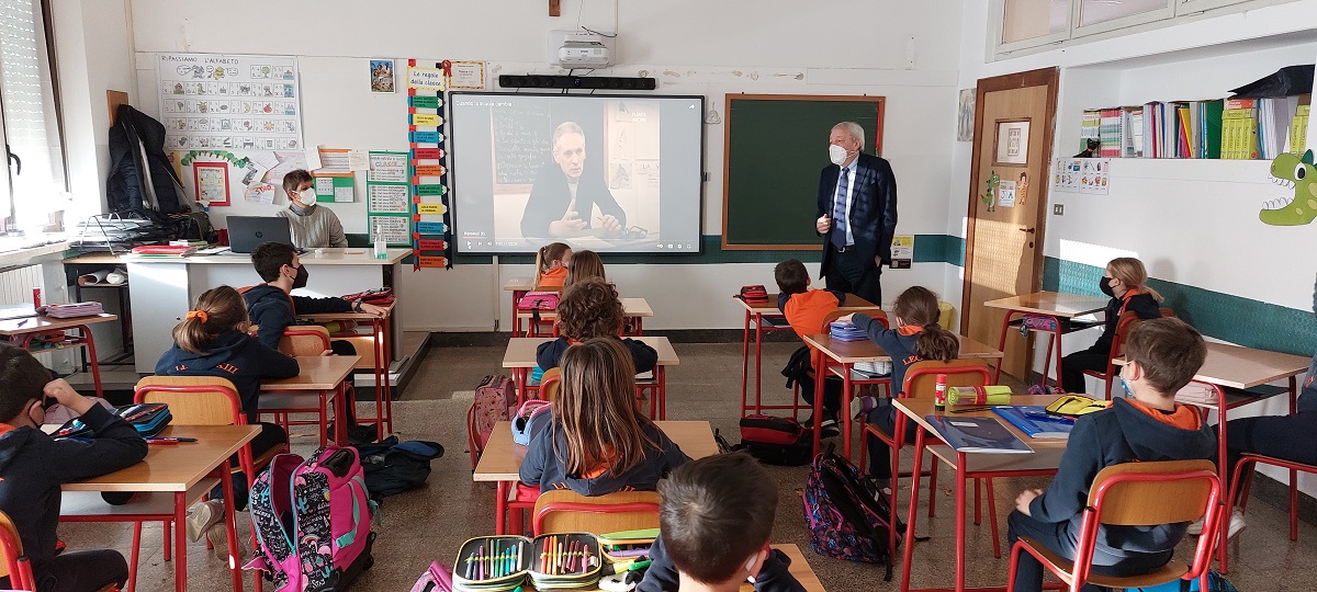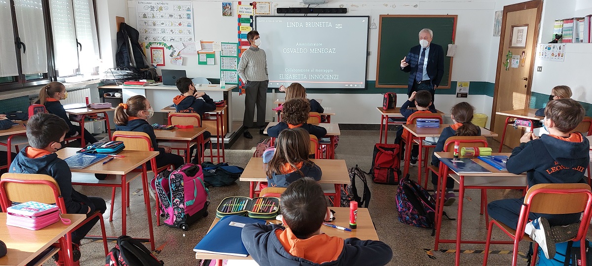 Una storia che gli alunni di Terza A hanno potuto ascoltare nella mattinata di oggi, con il maestro Rech che spiegava ad un pubblico incantato il documentario di Vittorio De Seta mandato in onda dalla RAI nel 1979 sull’esperienza della scuola del Vho: “Ecco, questa è la casa in cui sono nato, e questa pochi metri dietro è la scuola… e molti di questi bambini che vedete nel video sono ancora oggi miei amici”, “Impossibile” scappa detto a mezza voce ad un alunno, tra lo stupito e l’incredulo. E invece è tutto vero: l’amicizia dei famigliari del nostro preside Rech con il maestro Lodi, le frequentazioni quotidiane a casa degli zii (“a me faceva un certo effetto vedere il maestro Lodi nel pomeriggio a casa degli zii dopo averlo visto in classe la mattina”). Frequentazioni che diventano poi, nell’età adulta, di natura professionale e che continuano nell’attività didattica qui al Leone, con l’accompagnamento delle scolaresche alla Casa delle Arti e del Gioco, presso una cascina di Drizzona, vicino a Piadena, dove Mario Lodi si era trasferito dopo il pensionamento.
