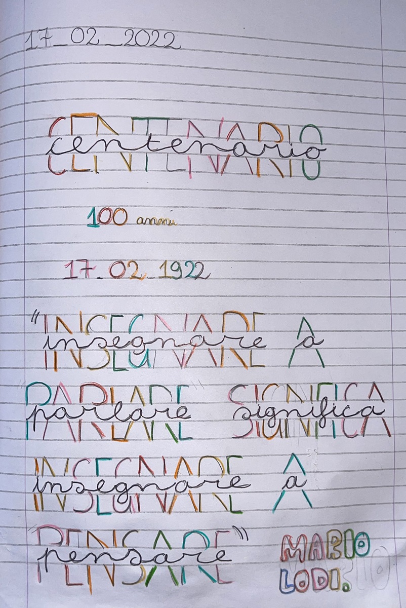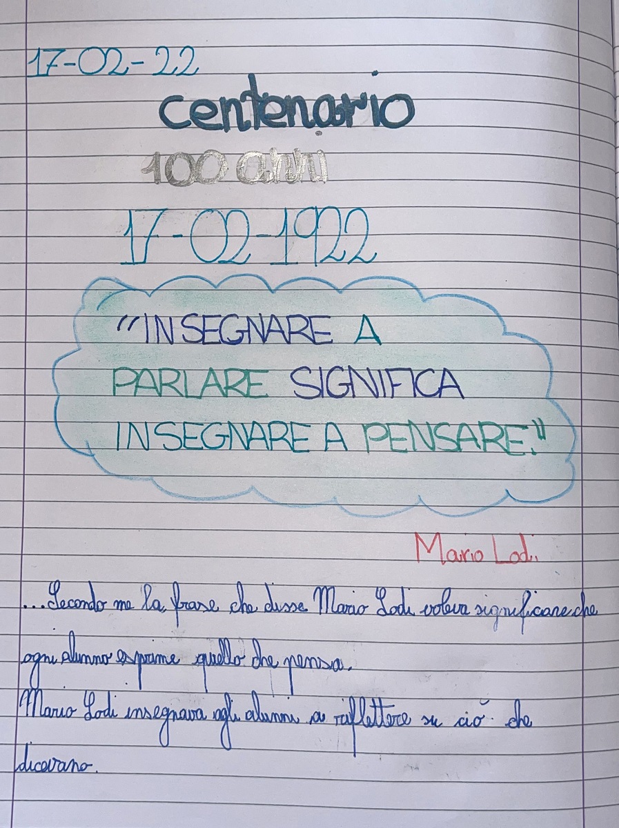 La Scuola Primaria dell’Istituto Leone XIII ha celebrato oggi l’importante centenario della nascita di Mario Lodi (Piadena, 17 febbraio 1922 – Drizzona, 2 marzo 2014) con una serie di attività nelle classi: dalla lettura di brani tratti da alcune opere di Lodi (immancabile “Cipì” – da cui prende il nome la Biblioteca della Primaria –, ma anche “Bandiere”) alla partecipazione, a partire dai giorni scorsi, al contest creativo nazionale “Se io fossi Cipì”; e ancora, dalla stesura di elaborati e disegni alla progettazione e creazione di una mostra che andrà in scena dal 7 all’11 marzo nell’aula di inglese in terrazzo. Tanto altro si potrebbe aggiungere (ad esempio, una raccolta di idee laboratoriali sull’opera di Lodi, condivise tra tutti i docenti, che forniranno uno spunto prezioso anche nei mesi a venire).