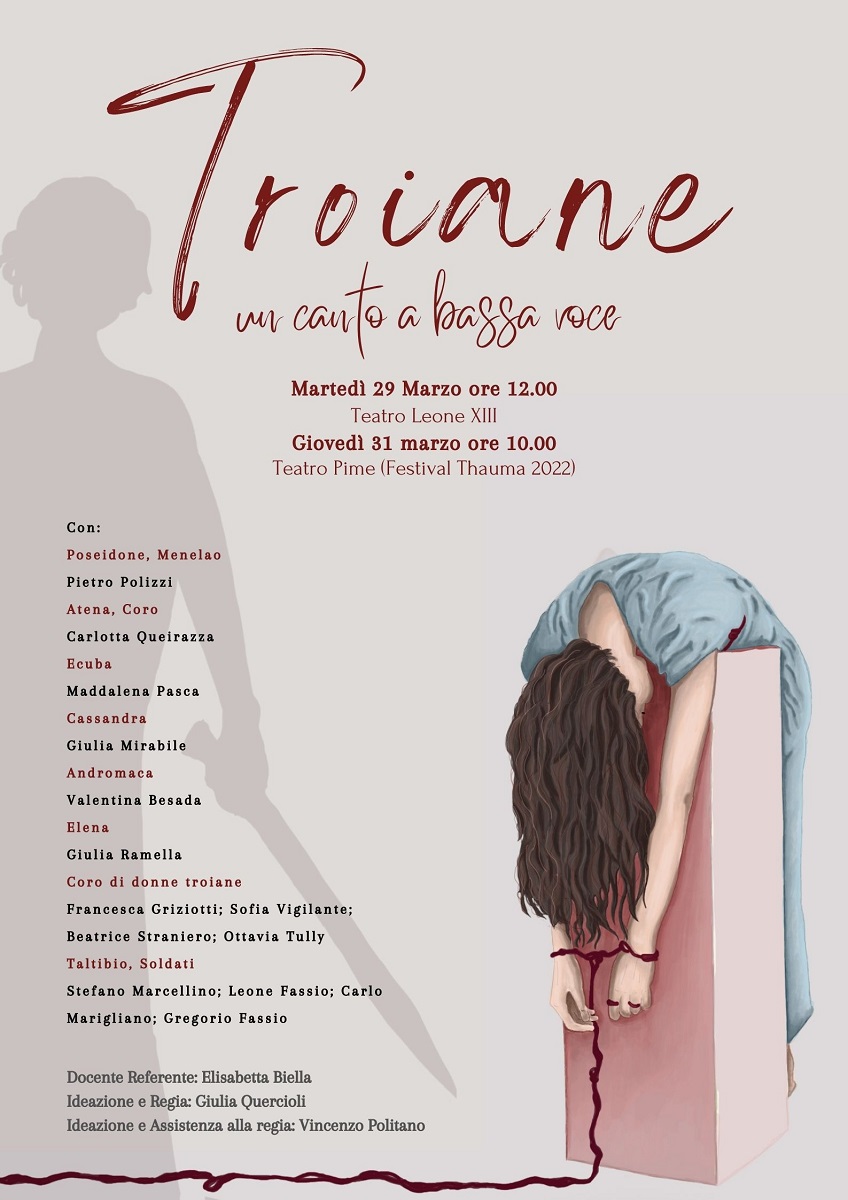 La Quarta Liceo Classico, quasi al completo, sta finendo di montare lo spettacolo su cui stiamo studiando e provando da ottobre: si tratta di Troiane di Euripide, con sguardi a Troades di Seneca e Troyennes di Sartre. Si tratta di un’opera in cui l’antimilitarismo euripideo trova nell’antichità la sua concretezza grazie a riferimenti, molto espliciti per il pubblico ateniese del tempo, a un’aggressione militare contro gli abitanti dell’isola di Melo nell’Egeo, che furono decimati e in parte deportati: Atene volle così imporre un’alleanza gravosa e contraria alle tradizioni di autonomia dell’isola. Oggi vorremmo che questa tragedia fosse meno attuale, ma non sempre historia magistra vitae est…