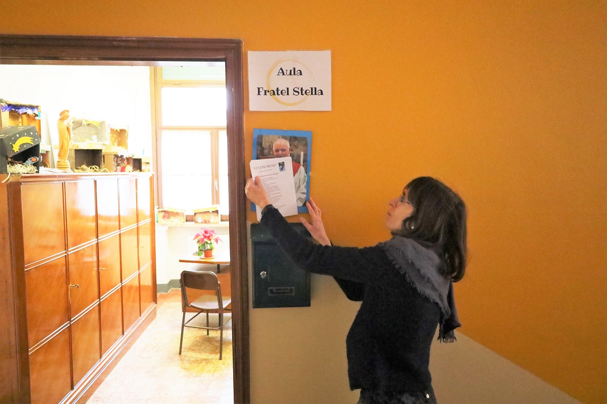La prof.ssa Maria Letizia Cova, Coordinatrice didattica della Scuola Primaria, mentre pone la fotografia di fr. Stella all’ingresso dell’aula a lui dedicata.