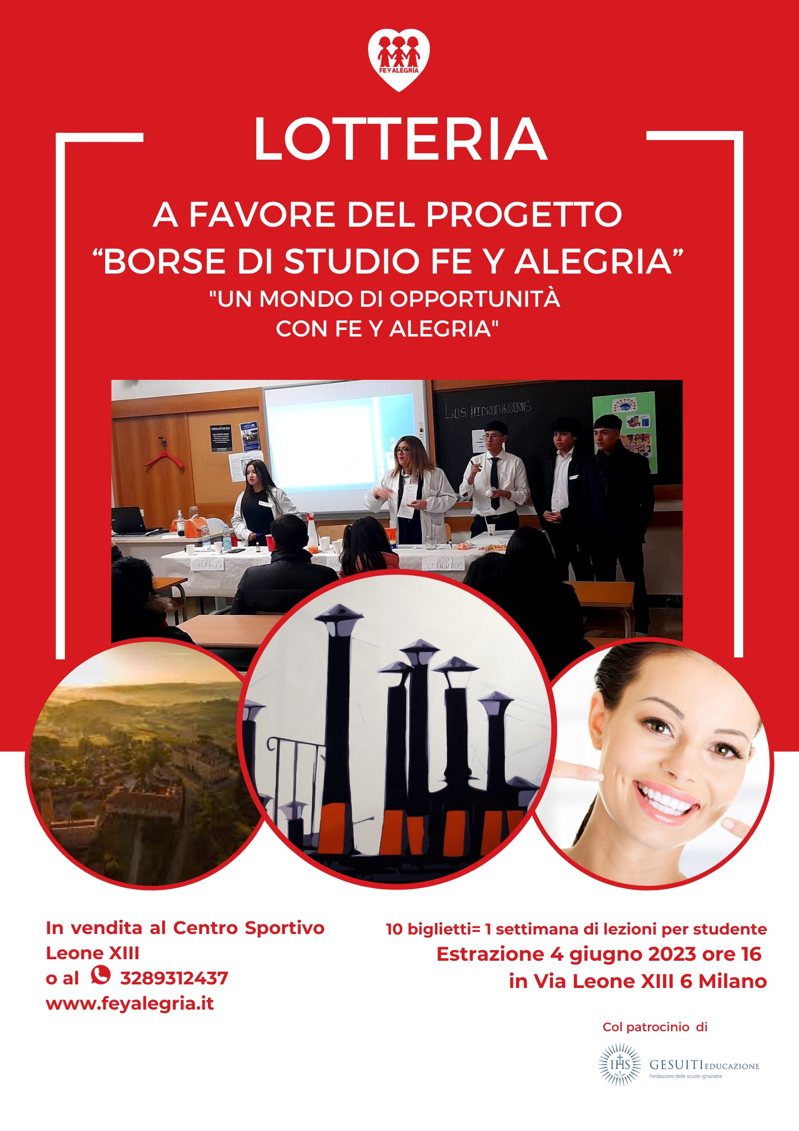 Fe y Alegria Italia organizza, col patrocinio della Fondazione Gesuiti Educazione e in collaborazione con il nostro Istituto, la lotteria solidale “Un mondo di opportunità con Fe Y Alegria” a favore del progetto “Borse di studio Fe y Alegria” per offrire a uomini e donne in difficoltà l’opportunità di costruirsi un futuro migliore attraverso l’educazione.