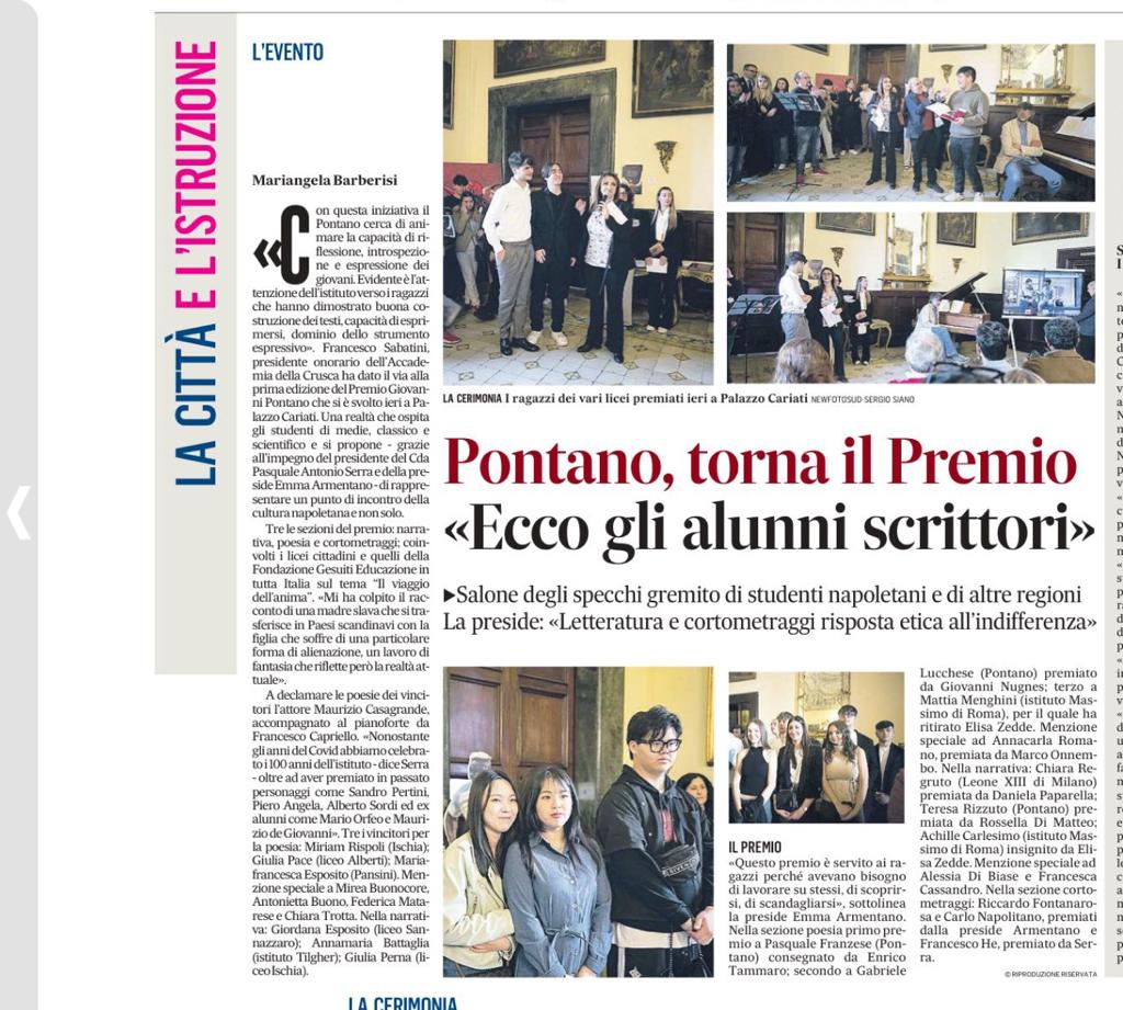 Sabato 6 maggio, presso la Sala degli Specchi di Palazzo Cariati a Napoli, si è svolta la premiazione del I Premio Letterario “Giovanni Pontano”, promosso dall’Istituto Pontano ed aperto ai licei partenopei e a tutte le scuole italiane della Fondazione Gesuiti Educazione.