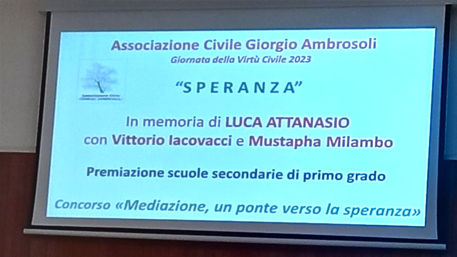Il 23 novembre u.s. si è svolta l’annuale Giornata per la Virtù Civile promossa dalla Associazione Civile Giorgio Ambrosoli, giunta quest’anno alla sua XV edizione. Il tema di quest’anno è la “speranza”, in memoria di Luca Attanasio con Vittorio Iacovacci e Mustapha Milambo. Le Scuole Medie erano invitate, in particolare, a concentrarsi sulla “speranza” così declinata: Mediazione, un ponte per la speranza.