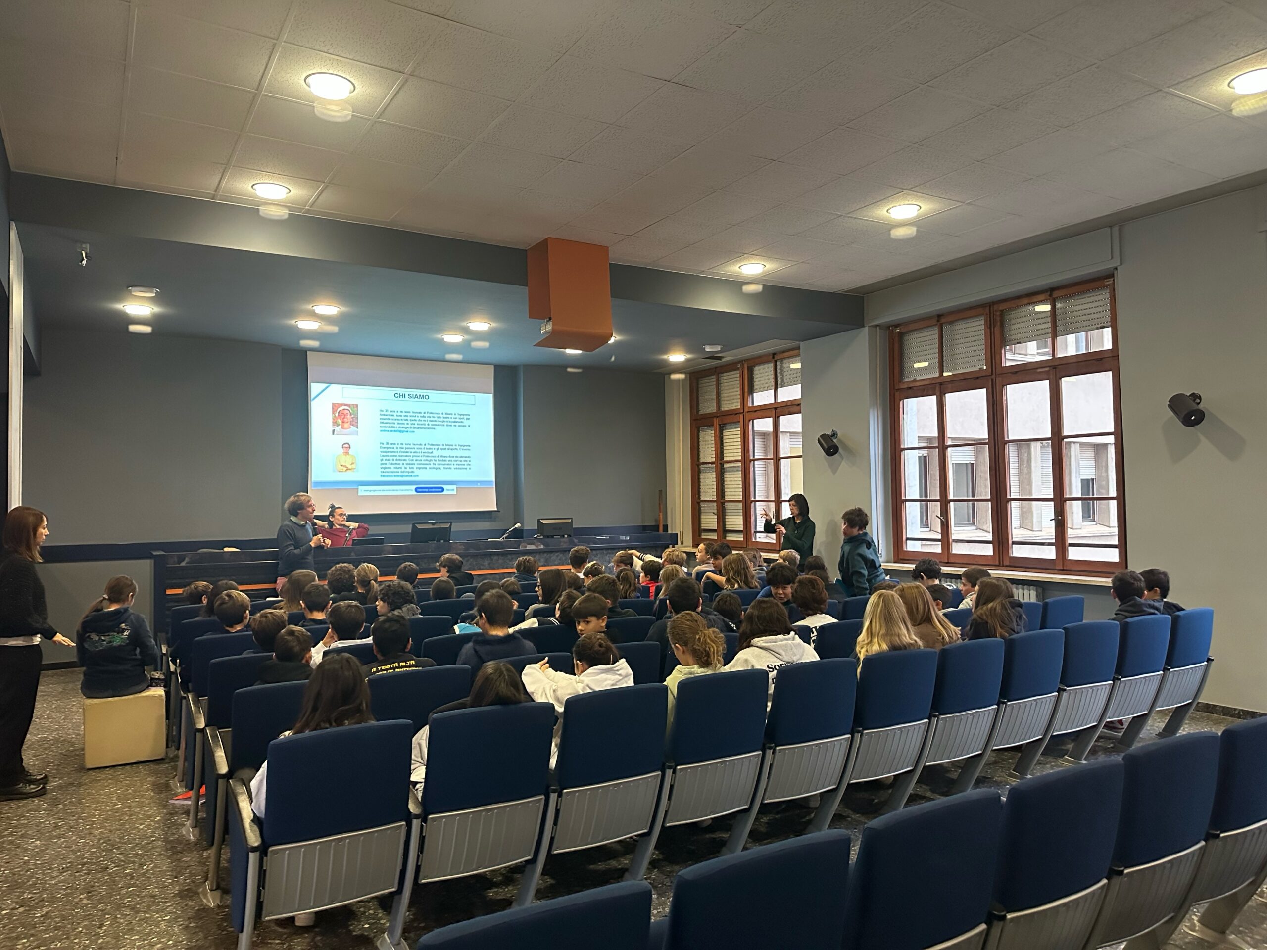 Queste sono solo alcune delle domande a cui i ragazzi delle classi terze della Scuola Secondaria di I Grado hanno cercato di rispondere, grazie all’aiuto di due giovani ingegneri del Politecnico di Milano. Il primo, Andrea Airoldi, laureato in Ingegneria Ambientale e attualmente consulente ambientale sulla gestione dei rifiuti presso una società di ingegneria. Il secondo, Francesco Tonini, ricercatore presso il Politecnico, si occupa di analisi dell’impatto sociale ed ambientale associato ai progetti di accesso all’energia nei paesi in via di sviluppo. Hanno conquistato i ragazzi a suon di Kahoot, domande su Wooclap e brain storming, senza perdere mai la loro attenzione.