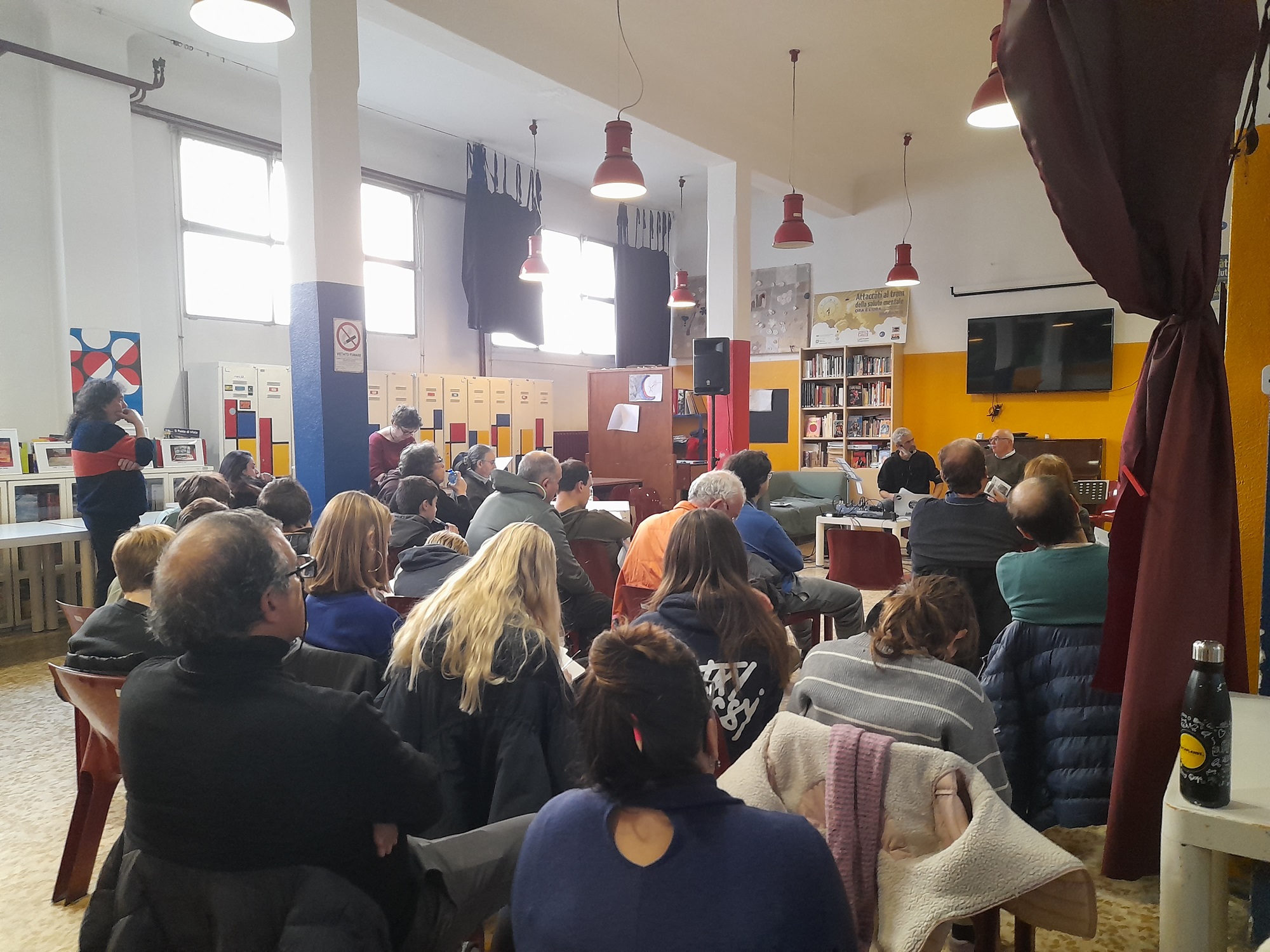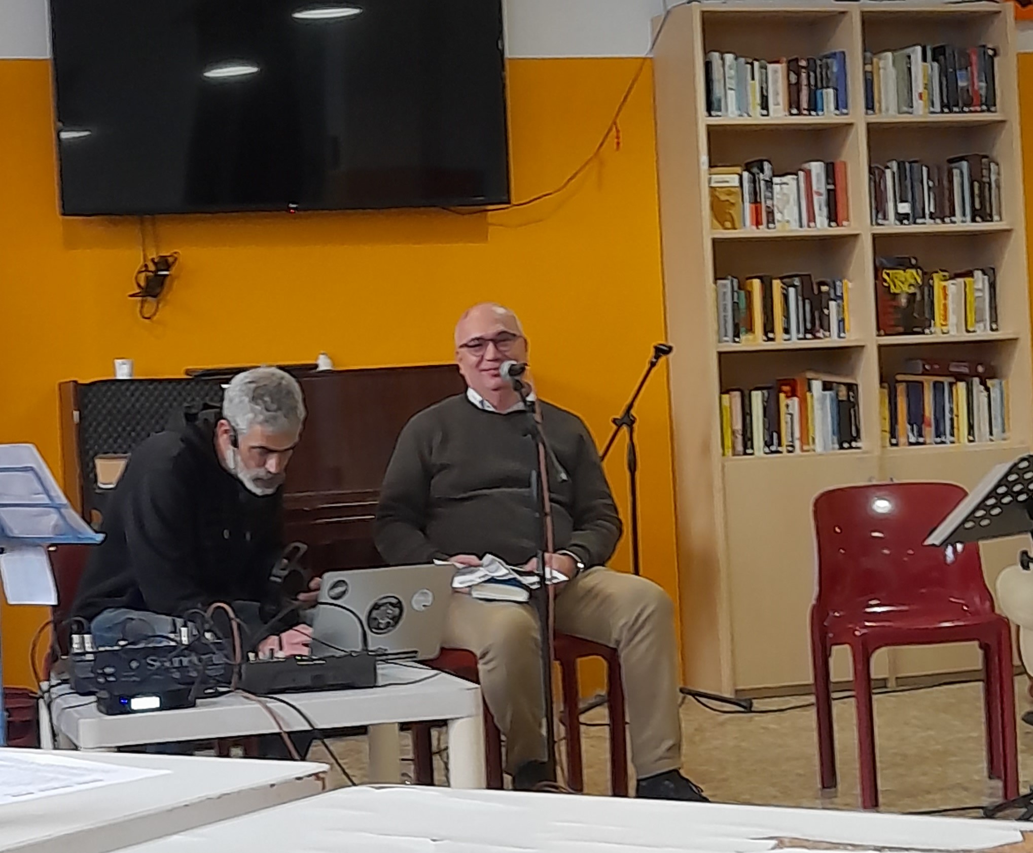 Noi eravamo seduti su delle sedie, mentre c’erano alcuni lettori su dei divani che, nelle pause, leggevano delle poesie. Nella grande aula vi era una consolle e dei microfoni per la trasmissione e, sulle pareti, si trovavano quadri e foto. La gente presente era molto silenziosa e attenta.
