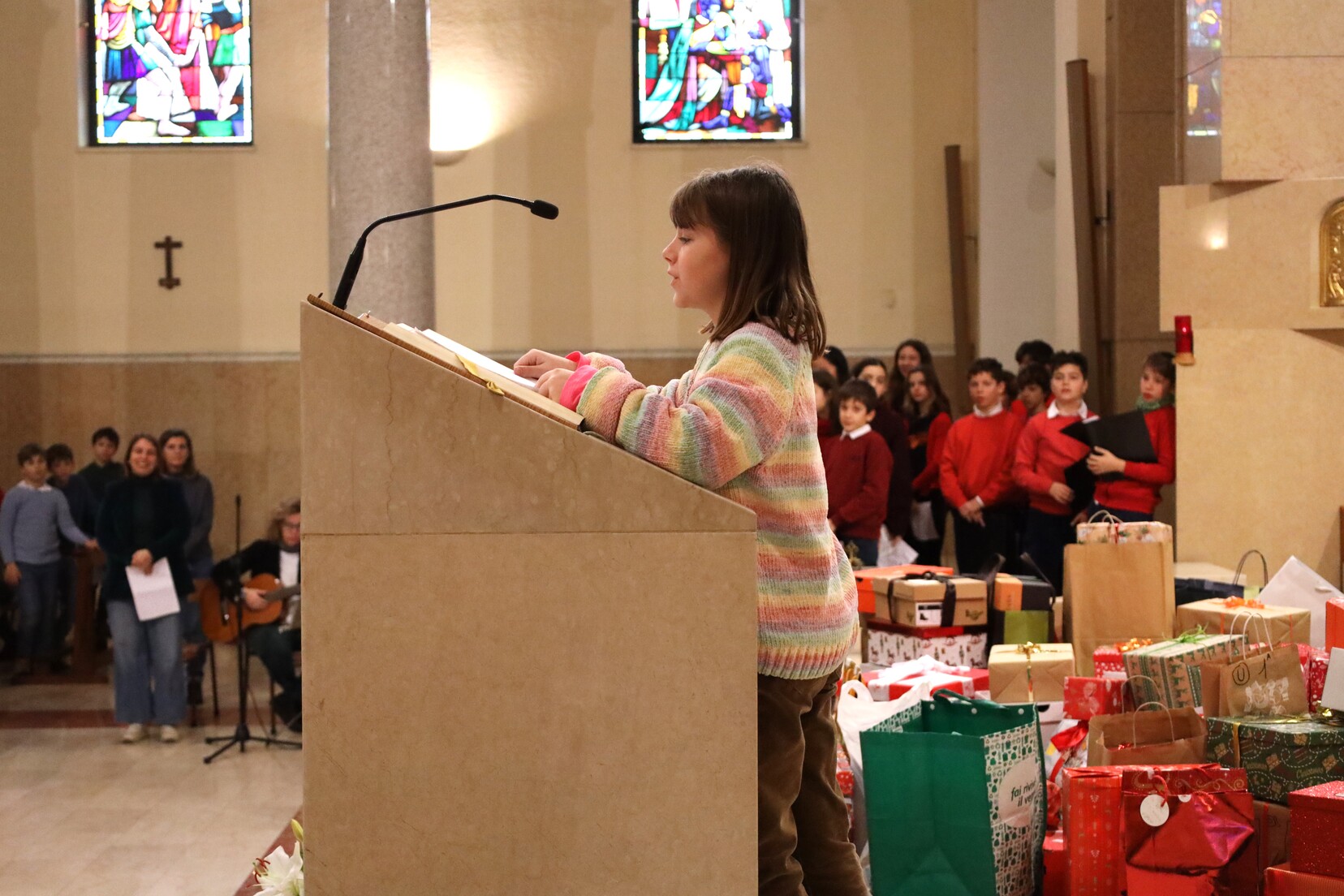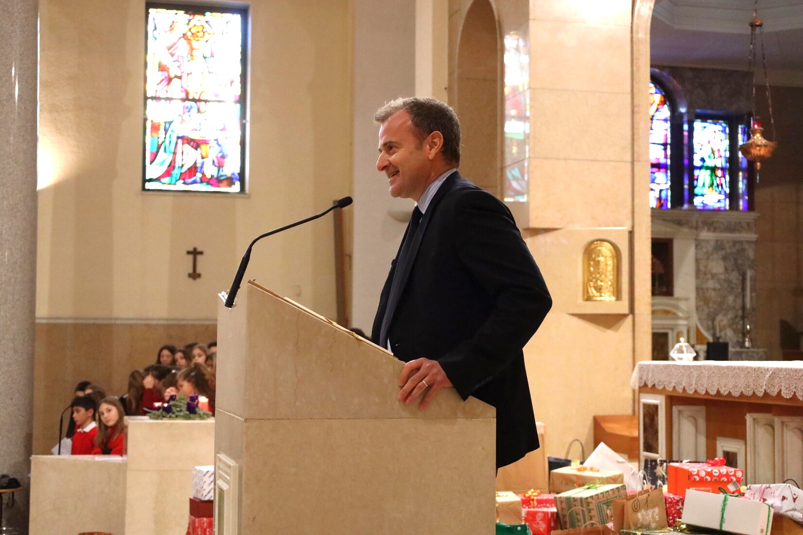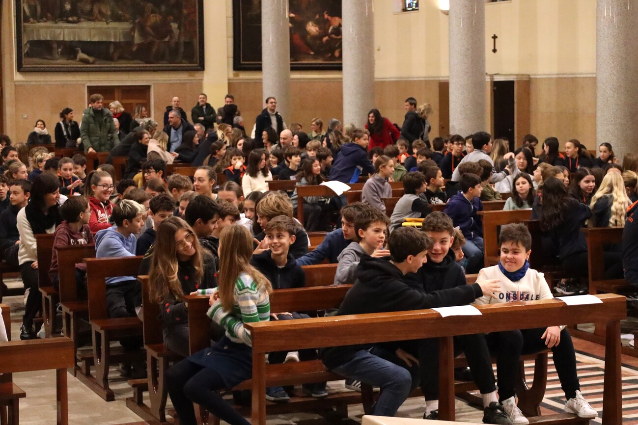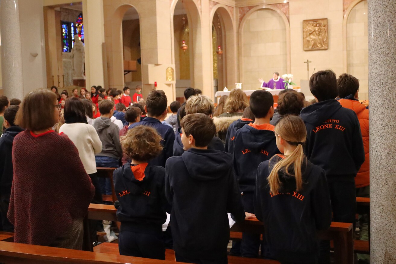 Nella mattinata di oggi si è celebrata la tradizionale Messa per le festività natalizie della Scuola Secondaria di I Grado. Nella chiesa gremita dagli studenti e da genitori e parenti spiccava l’immagine del Bambin Gesù, collocato davanti all’altare, circondato dai doni per i più bisognosi raccolti in questi giorni.