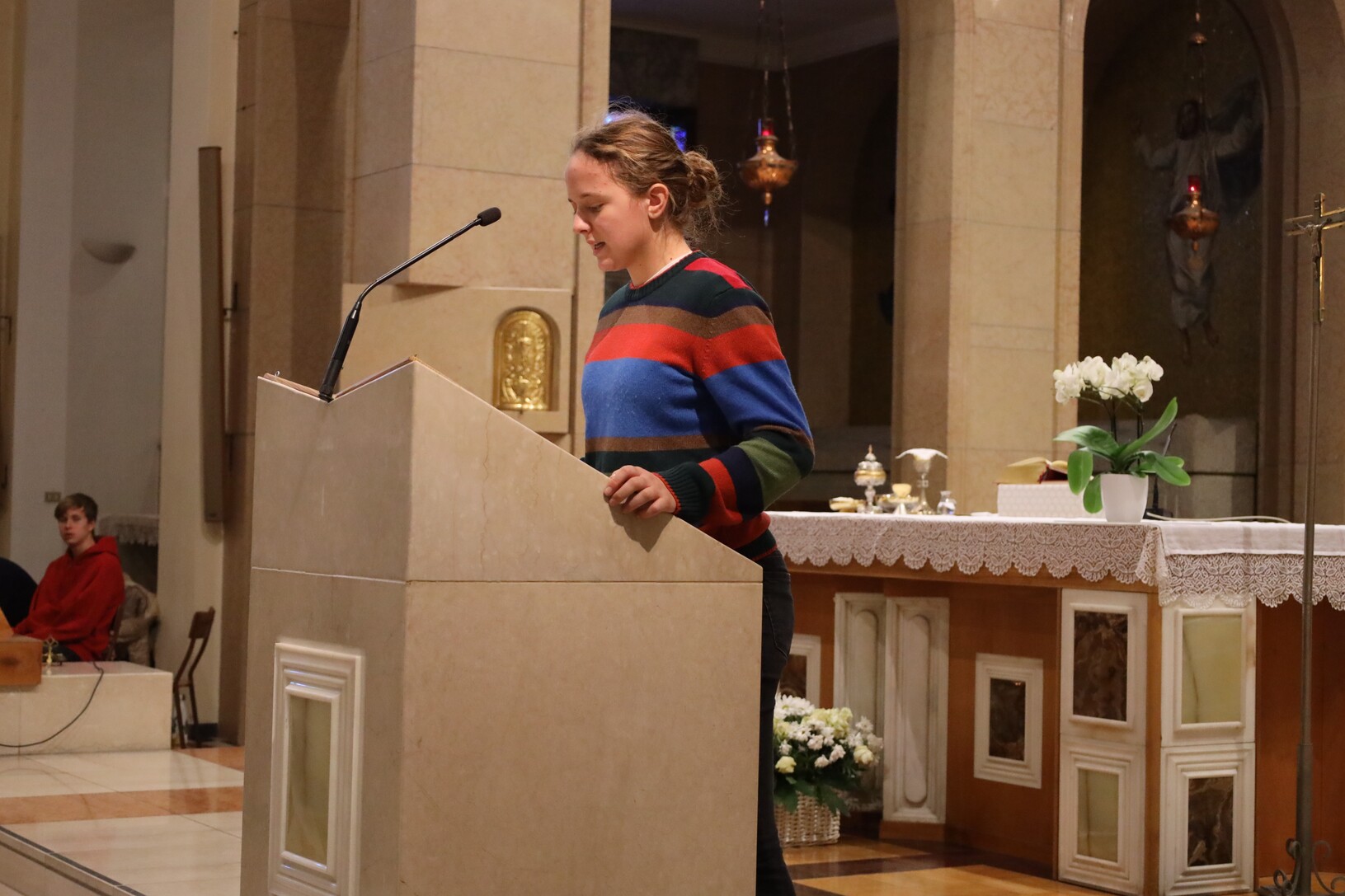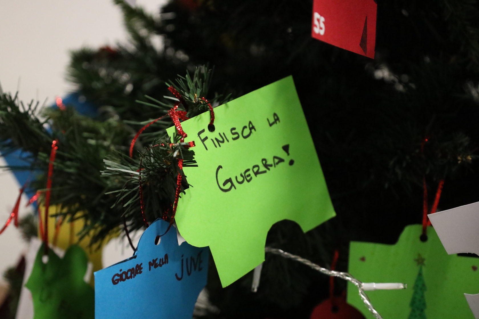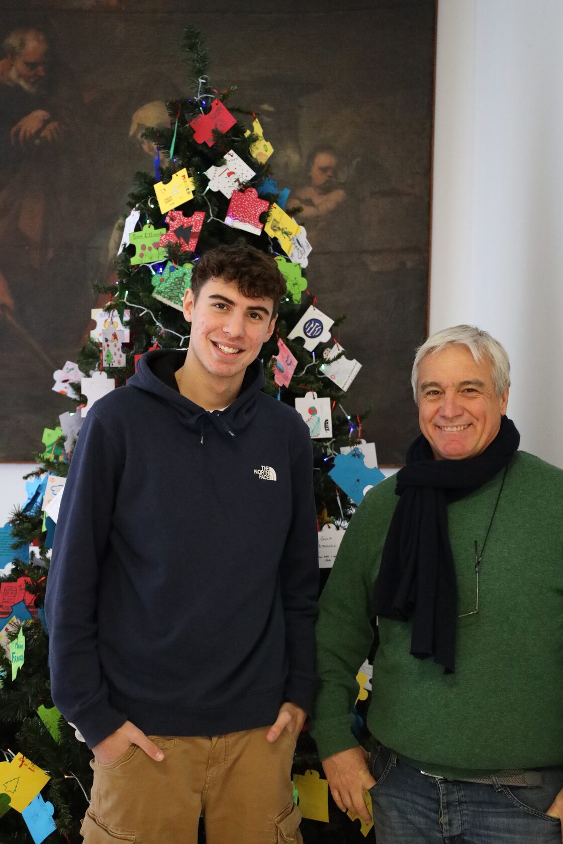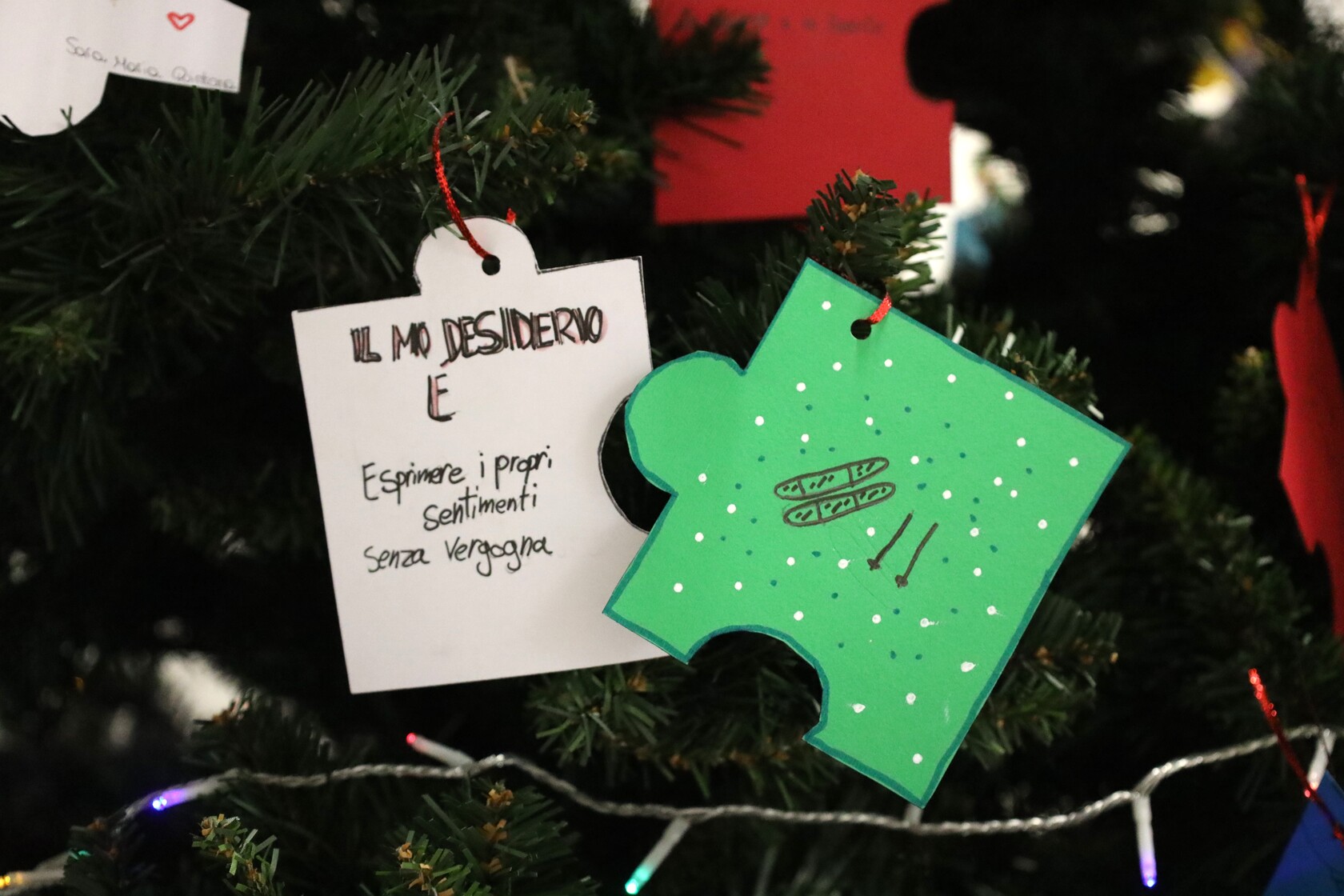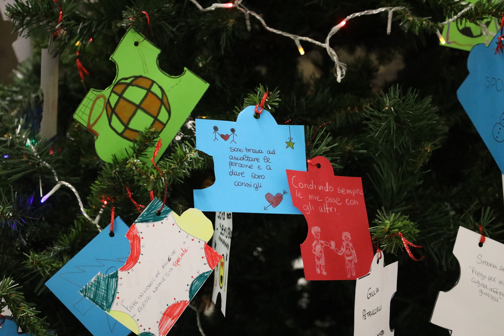 Nei bigliettini che quest’anno adornano l’albero grande del Leone, scritti da tutti i ragazzi e le ragazze della Scuola Secondaria di I Grado a partire da una riflessione sul tema pastorale di questo anno scolastico: “uomini e donne per gli altri”. Bigliettini fatti a forma di puzzle, ad indicare come ciascuno di noi abbia una parte che sporge – cioè i nostri talenti, i nostri pregi e le nostre doti – e una parte a rientrare, qualcosa che manca – a simboleggiare le nostre carenze. Tutti insieme però componiamo, come in un grande puzzle, possiamo comporre il disegno di Dio, unendoci e compensandoci a vicenda con ciò che possiamo offrire per aiutare gli altri (bellissimi i testi degli studenti!).