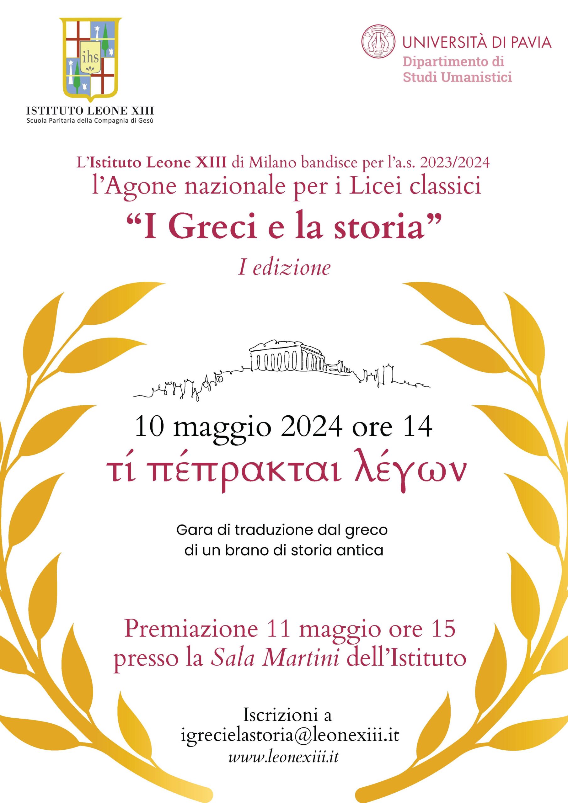 Febbraio 6, 2024 Categoria: News, Home pageIl Liceo Classico dell’Istituto Leone XIII di Milano, in collaborazione con il Dipartimento di Studi Umanistici dell’Università degli Studi di Pavia, indice per l’a.s. 2023/24 la prima edizione dell’agone nazionale I Greci e la storia.