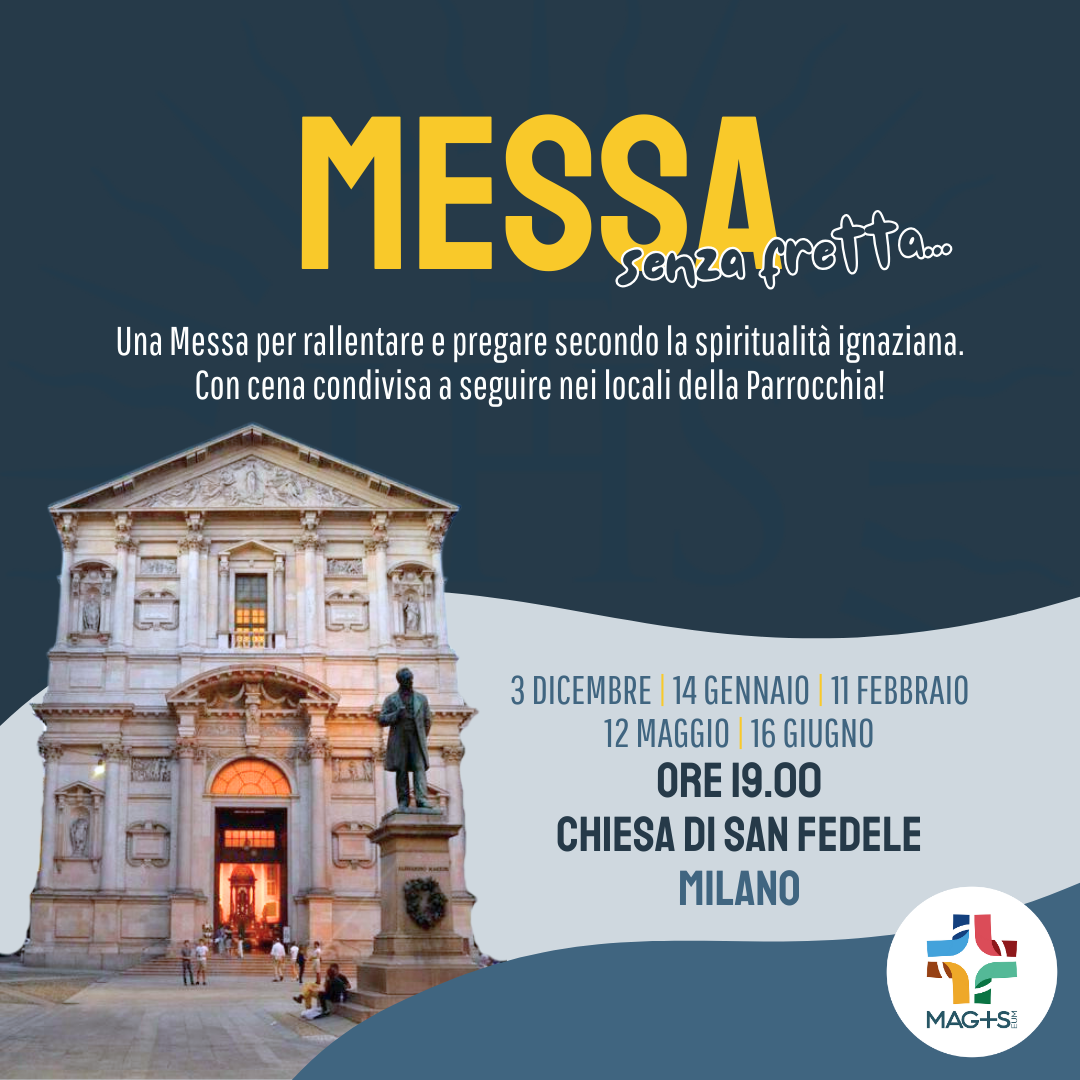 Proponiamo le “Messe senza fretta” anche nello spirito della nuova rete MAG+S (qui il link al profilo Instagram), che ha l’obiettivo di connettere e sostenere le tante realtà giovanili ignaziane, ciascuna con la propria specificità, di dialogare con le altre esperienze ecclesiali locali e di cercare l’incontro con i giovani anche lontani dalla Chiesa. Sullo sfondo c’è il desiderio di accompagnare bambini, adolescenti e giovani a riconoscere, scegliere e vivere il magis, che è il modo migliore, diverso per ognuno, di amare e servire Dio e gli altri.