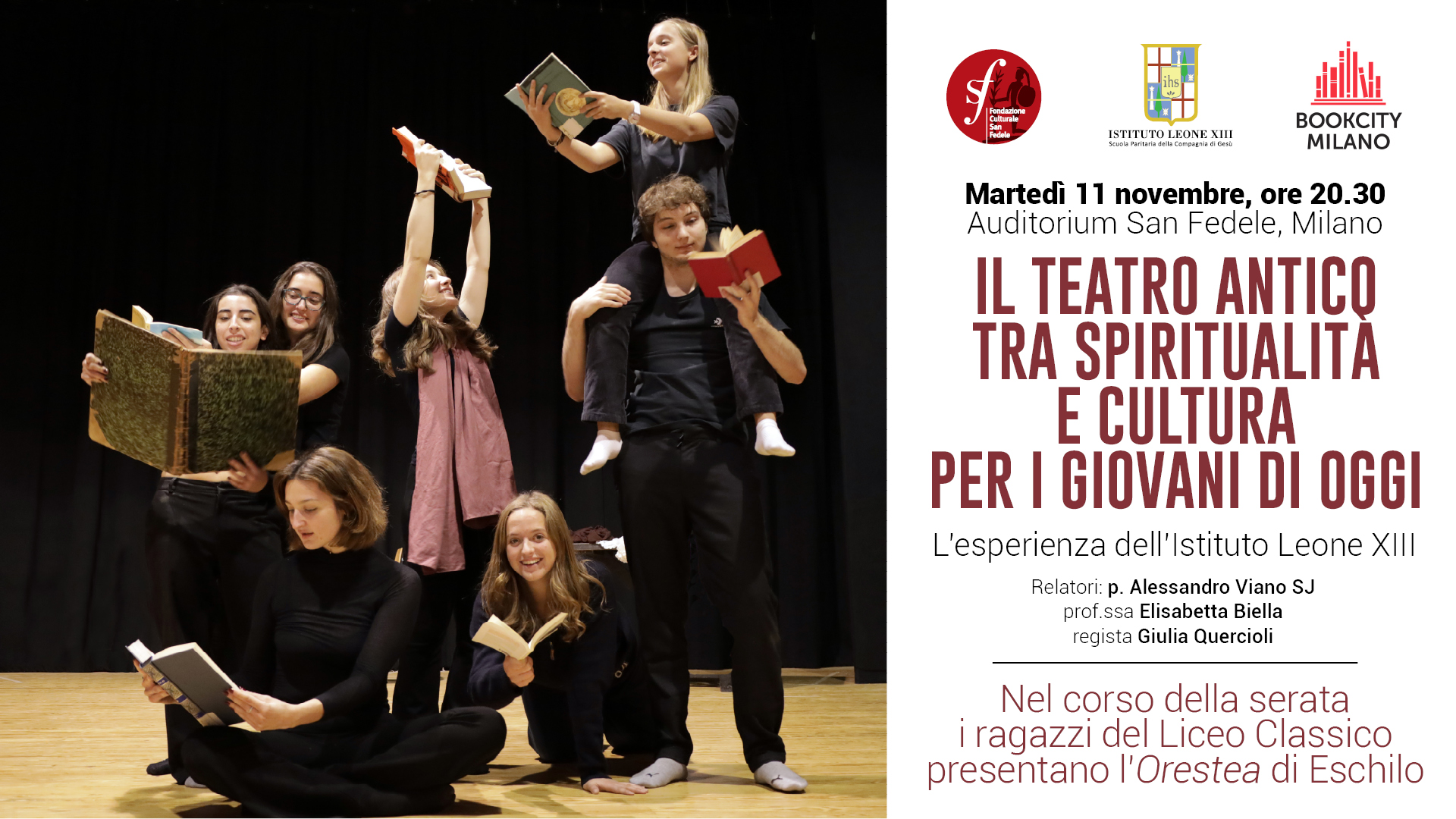 Martedì 11 novembre alle ore 20.30 nell’ambito di BookCity Milano presso l’Auditorium della Fondazione culturale San Fedele gli studenti aderenti al laboratorio Facciamo Teatro rappresenteranno Orestea di Eschilo all’interno di un evento dal titolo Il teatro antico tra spiritualità e cultura per i giovani di oggi – L’esperienza del Leone XIII.