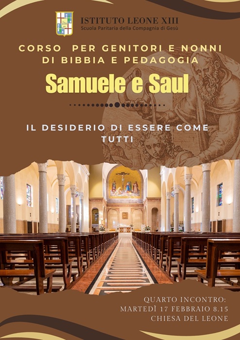 𝗠𝗮𝗿𝘁𝗲𝗱𝗶̀ 𝟭𝟳 𝗳𝗲𝗯𝗯𝗿𝗮𝗶𝗼 𝟮𝟬𝟮𝟲, alle ore 8.15, presso la Chiesa d’Istituto, si terrà il quarto incontro del 𝗖𝗼𝗿𝘀𝗼 𝗱𝗶 𝗕𝗶𝗯𝗯𝗶𝗮 𝗲 𝗽𝗲𝗱𝗮𝗴𝗼𝗴𝗶𝗮 𝗽𝗲𝗿 𝗴𝗲𝗻𝗶𝘁𝗼𝗿𝗶 𝗲 𝗻𝗼𝗻𝗻𝗶, dal titolo “Samuele e Saul: il desiderio di essere come tutti”.