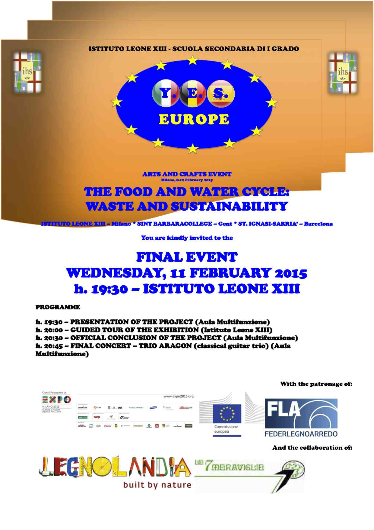 Si ferma per un anno il theatre event, terzo nato della serie, per lasciare spazio al nuovissimo arts and crafts event, una grande opportunità per agganciare il gemellaggio YES! all’evento mondiale dell’anno, l’esposizione universale EXPO 2015, che ha concesso il proprio patrocinio. Nelle aule e nei laboratori del Leone XIII trenta giovani artigiani e artisti si cimenteranno in lavori di pittura, intaglio, disegno e costruzione, dando espressione, con intelligenza e creatività, a un tema molto impegnativo: The food and water cyrcle: waste and sustainability.