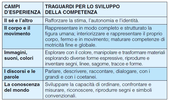 I campi di esperienza sono cinque: il sé e l’altro, il corpo e il movimento, immagini suoni colori, i discorsi e le parole, la conoscenza del mondo; a ciascuno corrispondono specifici traguardi per lo sviluppo delle competenze, intese a questa età in modo globale e unitario.