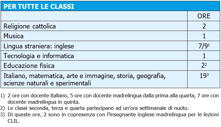 I Consigli di interclasse progettano le attività favorendo il graduale passaggio dalla visione culturale inter-transdisciplinare propria dei primi anni alla strutturazione disciplinare, nel rispetto del seguente tempo minimo da dedicare alle varie discipline: