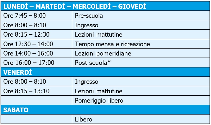 L’attività didattica si svolge in cinque giorni settimanali con un intervallo, tra la mattina e il pomeriggio, dedicato al pranzo e alla ricreazione.